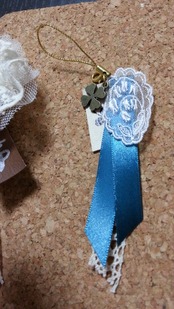 すずらんレースモチーフを若草色のリボン、ナチュラルレース、スタンプタグでナチュラルガーリーに仕上げましたっ。
